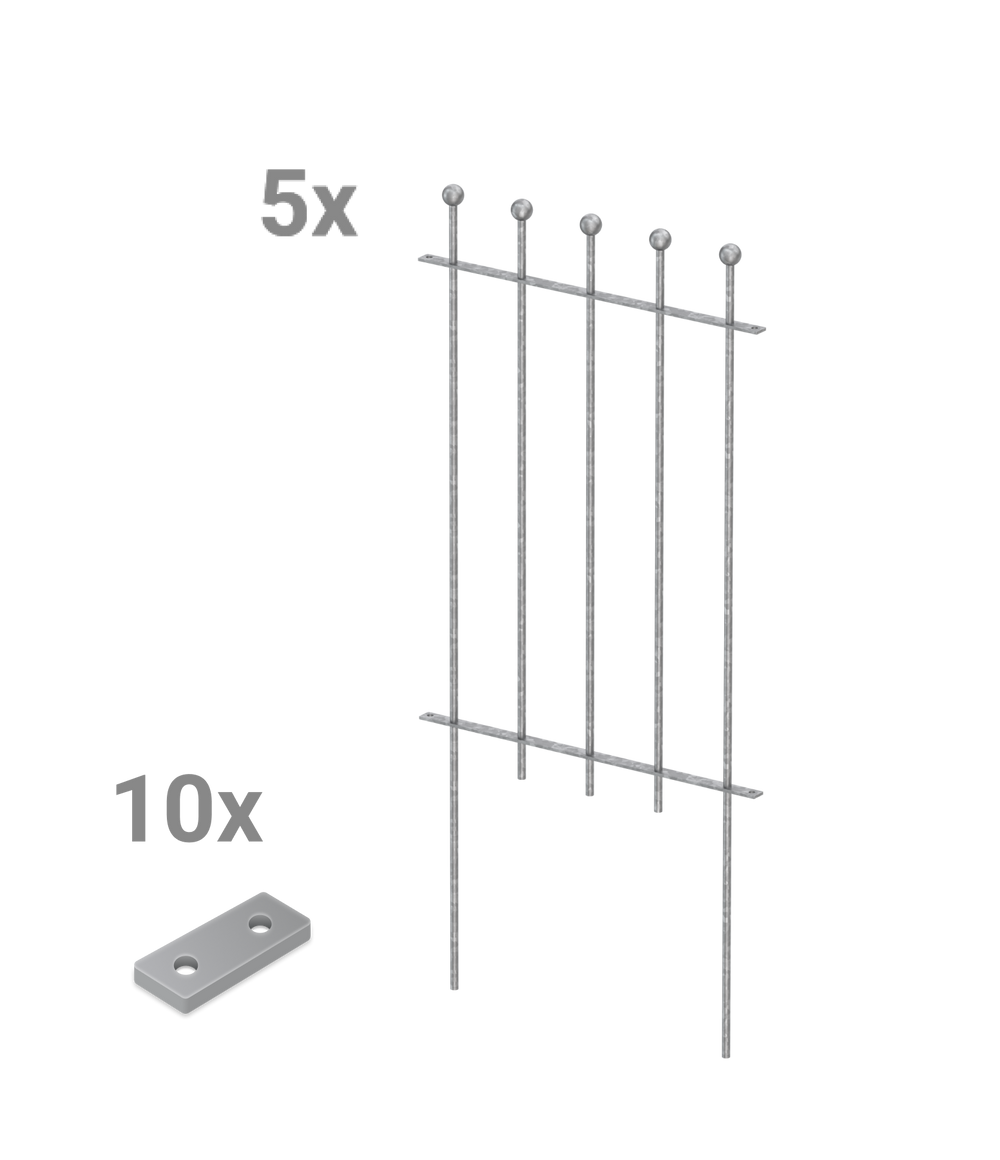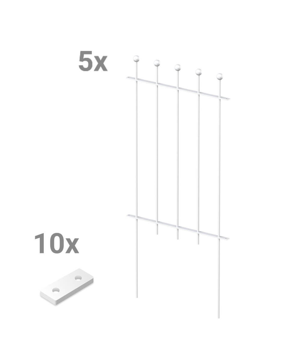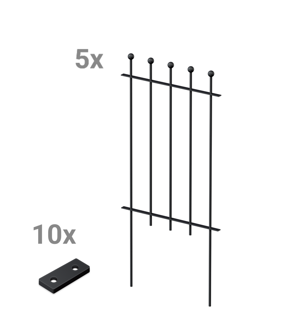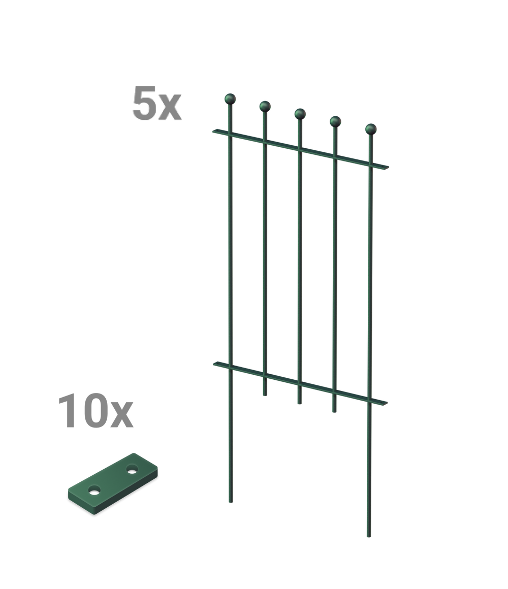 Koop ons sierhek "Ancona" in een voordelige, praktische complete set! "Ancona" valt op door zijn eenvoudige, elegante uitstraling en aantrekkelijke bolpunt. De set bevat vijf hekelementen, elk 50 cm breed en in totaal 105 cm hoog (inclusief punt en grondverankering). De losse elementen worden eenvoudig in de grond gestoken en met behulp van een verbindingsplaat en schroeven aan elkaar bevestigd. U kunt ook bij de set zelf de coating vrij kiezen.
