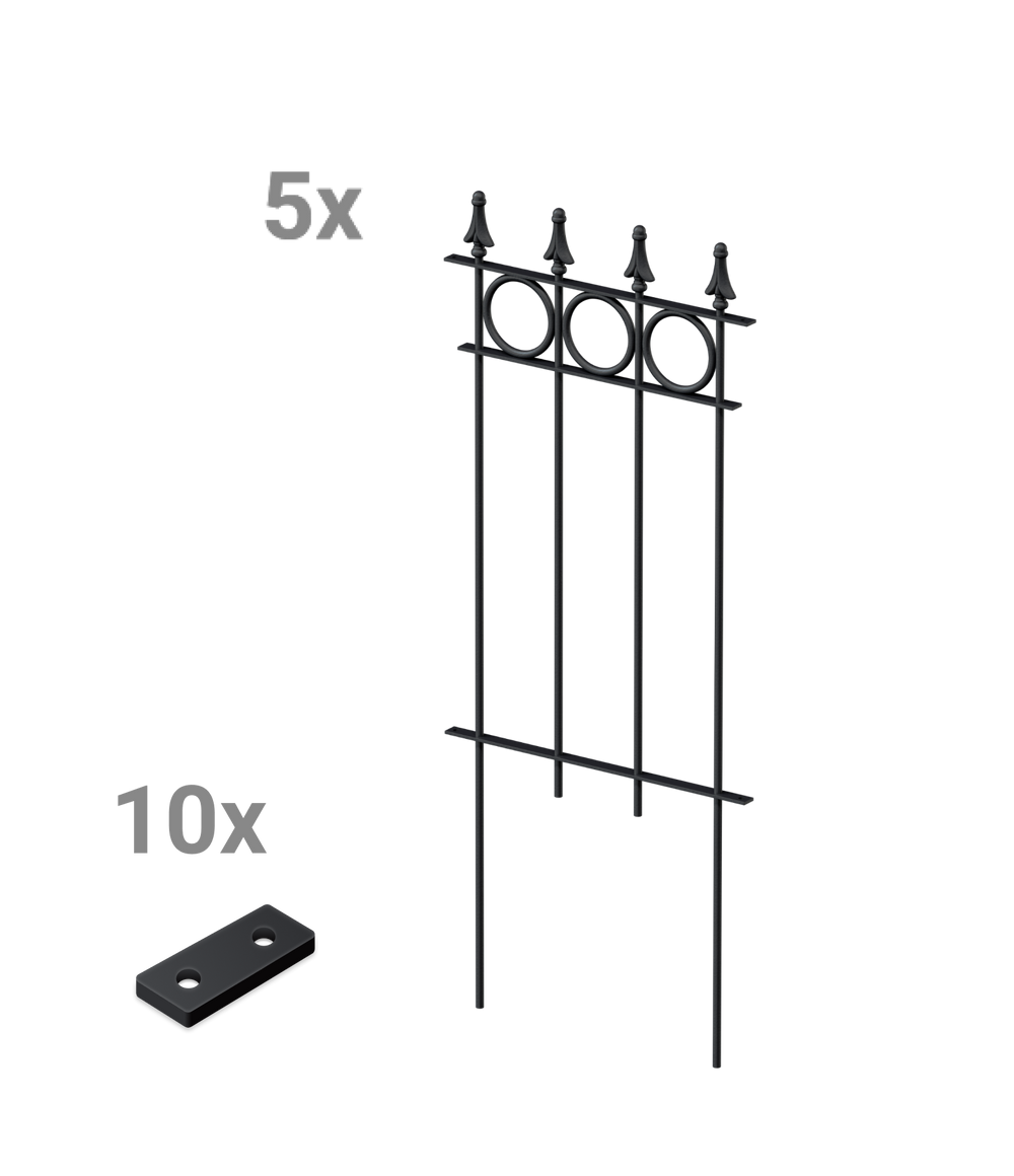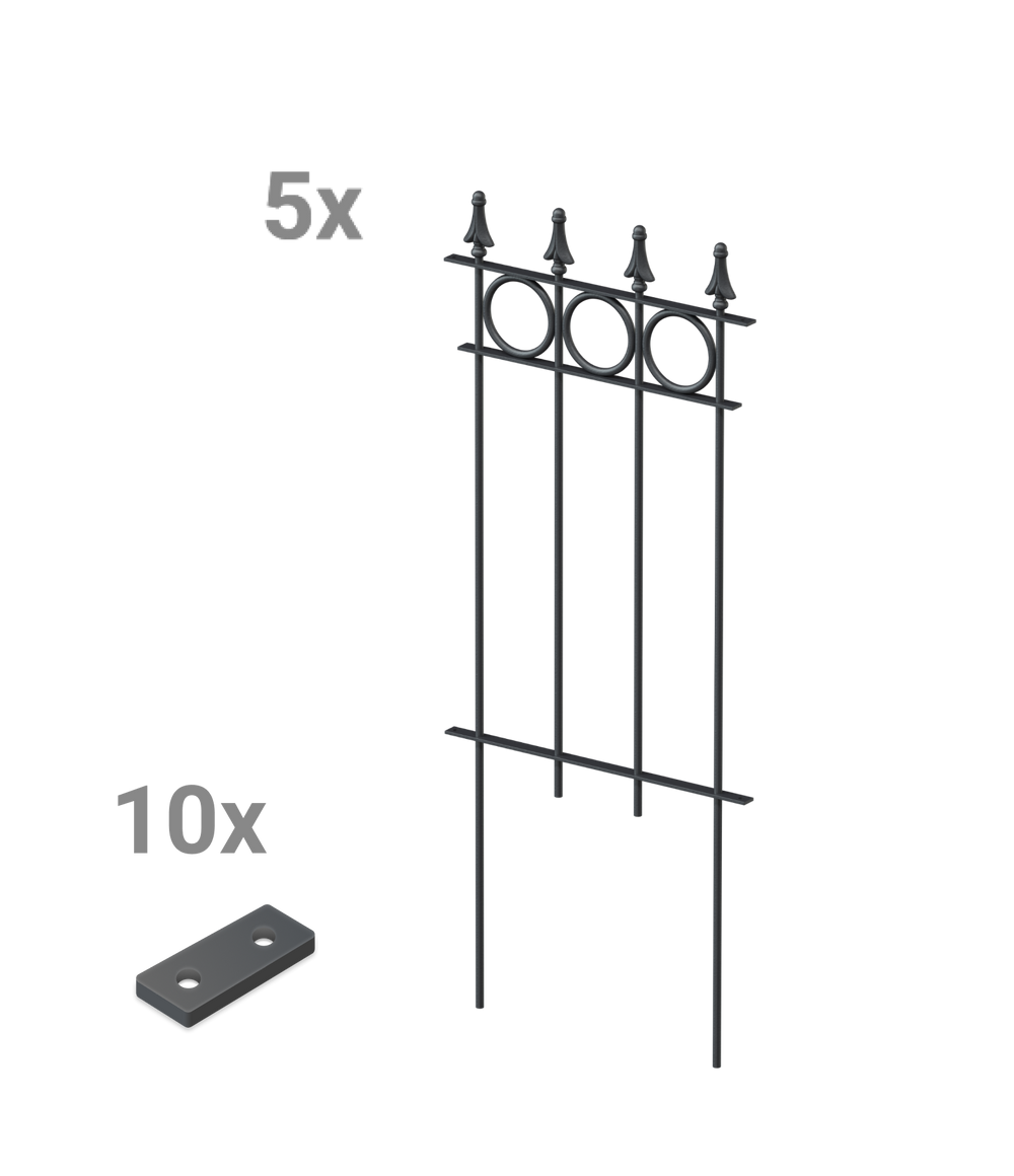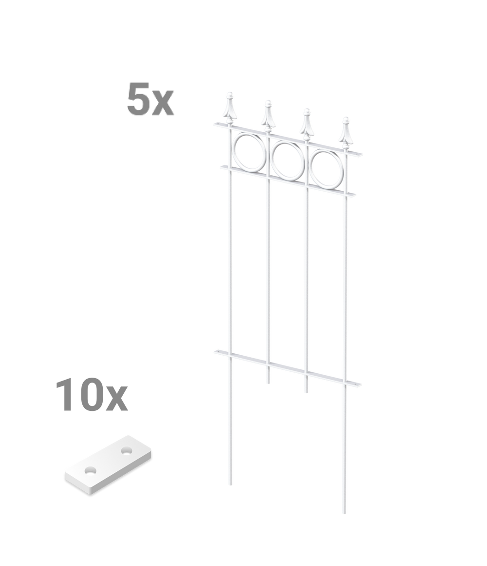 Ons sierhek "Belluno" ontvangt u hier als voordelige en praktische complete set, bestaande uit vijf hekelementen. "Belluno" valt op door zijn cirkelvormige ornamenten en de elegante sierpunt "Pinie". Elk element van het sierhek is 44,1 cm breed en 105 cm hoog, inclusief punt en grondverankering. De losse hekelementen kunnen eenvoudig met een klein verbindingsstuk aan elkaar worden geschroefd. Kies zelf de coating en geef uw sierhek "Belluno" zo een persoonlijke uitstraling!