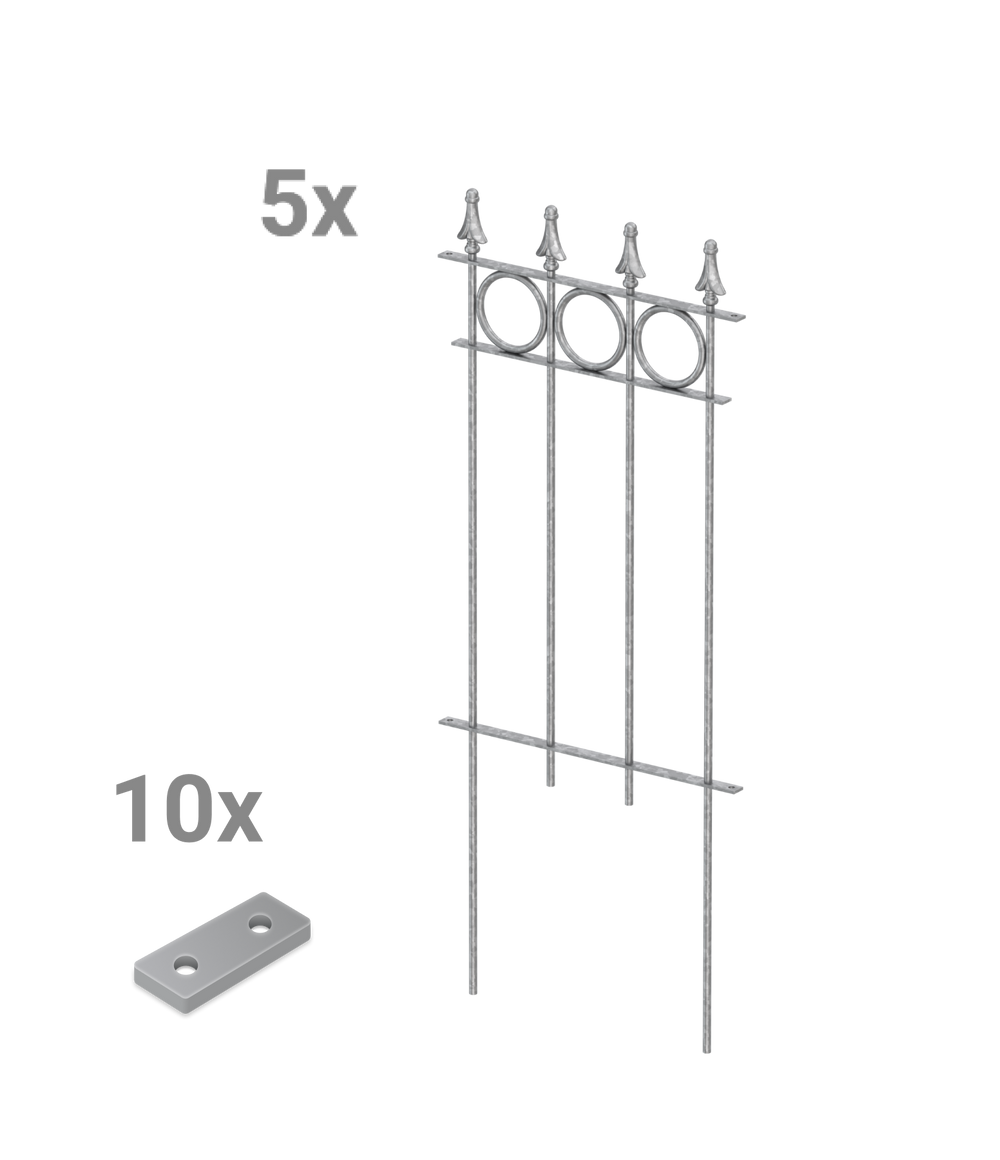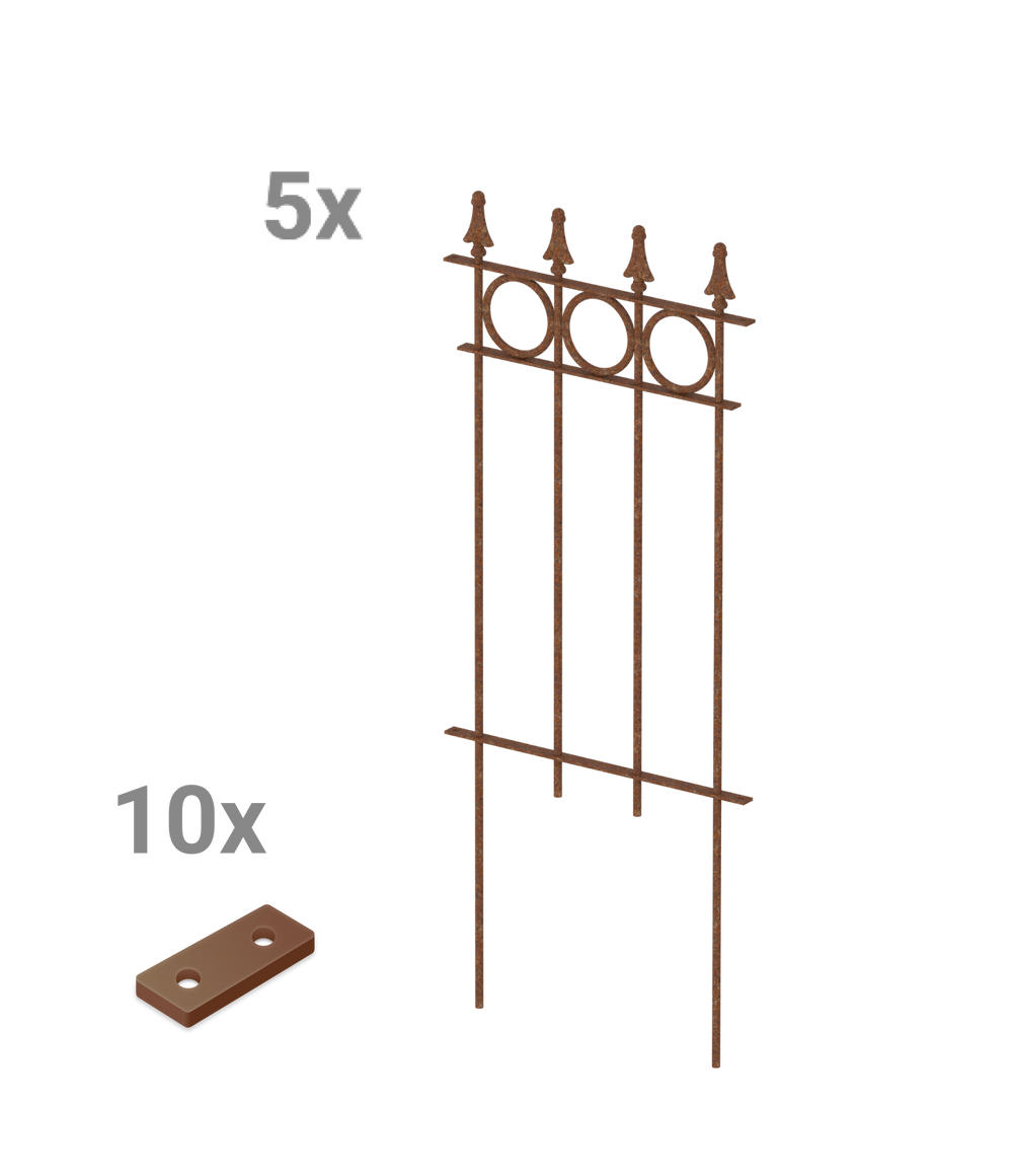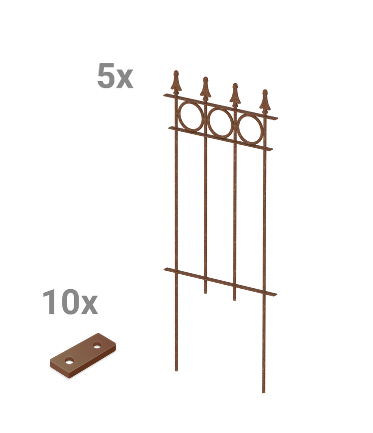 Ons sierhek "Belluno" ontvangt u hier als voordelige en praktische complete set, bestaande uit vijf hekelementen. "Belluno" valt op door zijn cirkelvormige ornamenten en de elegante sierpunt "Pinie". Elk element van het sierhek is 44,1 cm breed en 105 cm hoog, inclusief punt en grondverankering. De losse hekelementen kunnen eenvoudig met een klein verbindingsstuk aan elkaar worden geschroefd. Kies zelf de coating en geef uw sierhek "Belluno" zo een persoonlijke uitstraling!